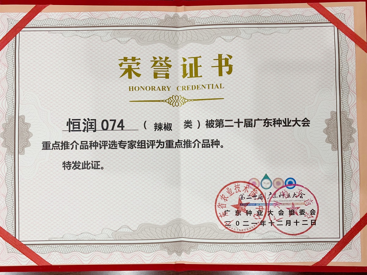 热烈祝贺:我公司辣椒品种“恒润074”在第二十届广东种业大会上被专家组评为“重点推介品种” !